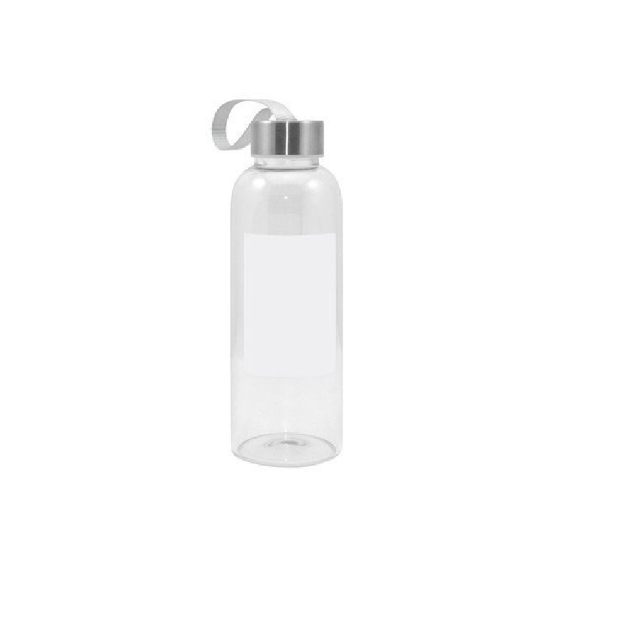 Glazen fles 420 ml met rechthoekige opdruk. Fles met metalen dop en handvat.