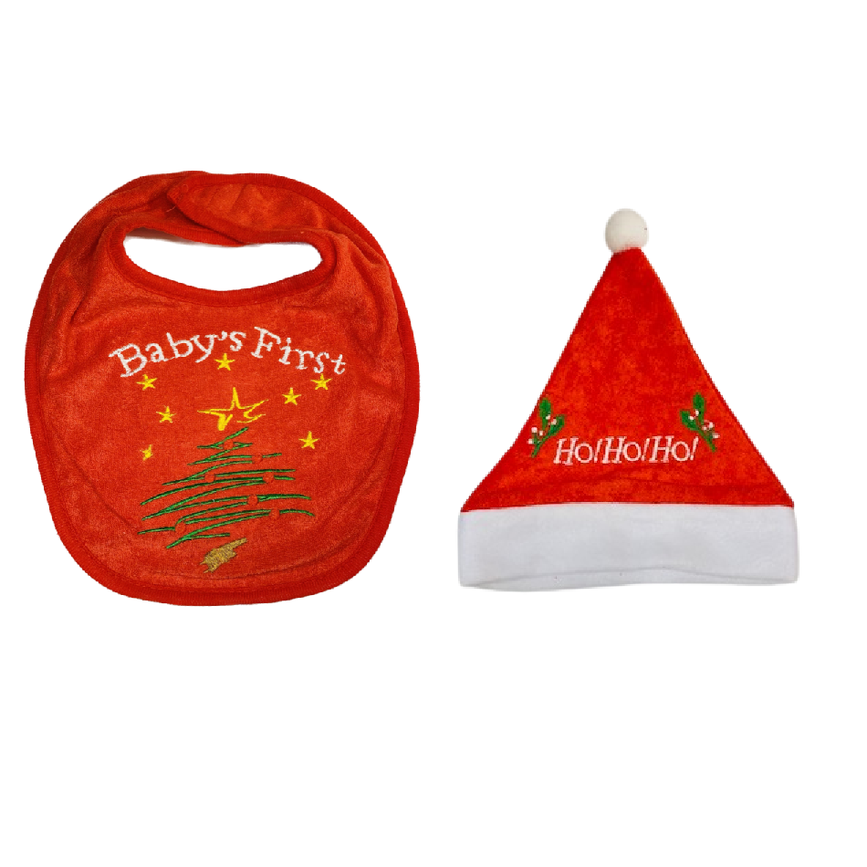 Slabbertje met tekst Baby’s first Kerstmutsje met tekst Ho!HO!HO! Beiden in de kleur rood